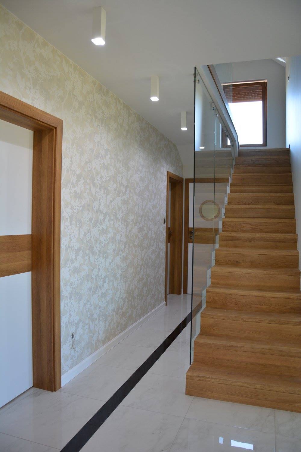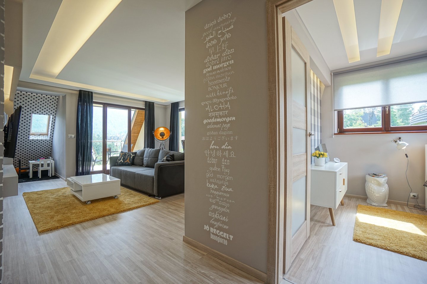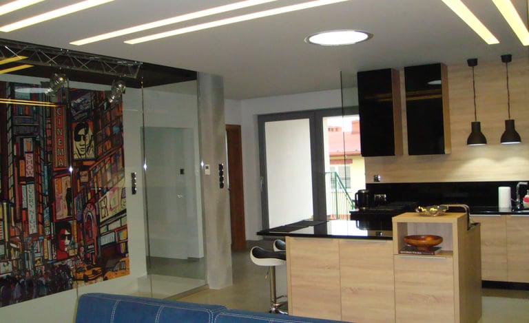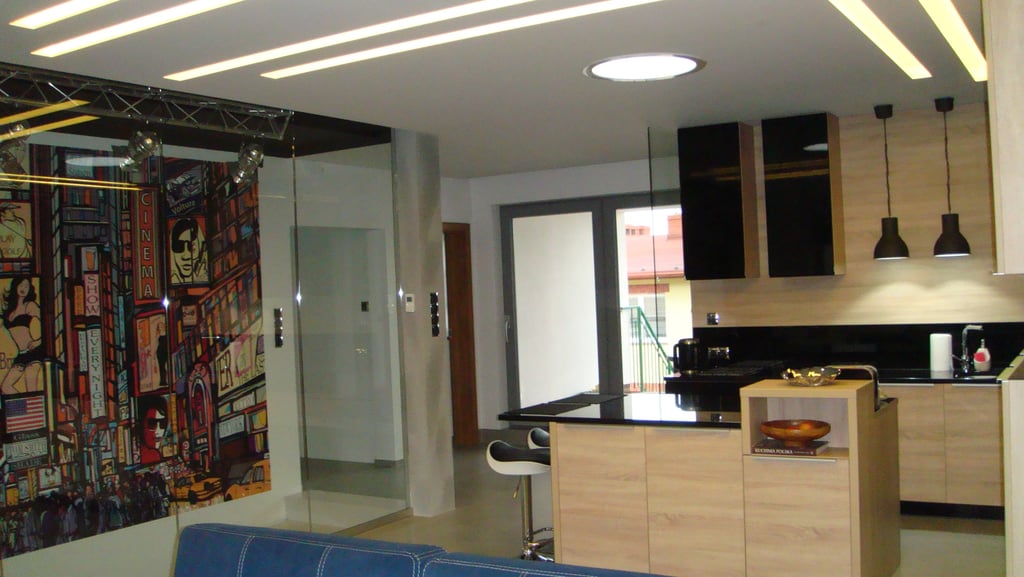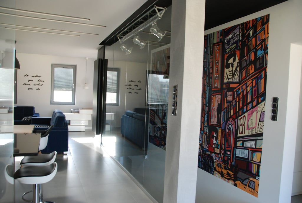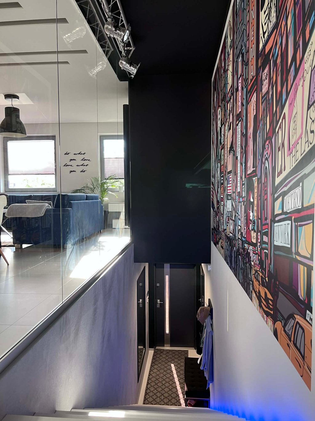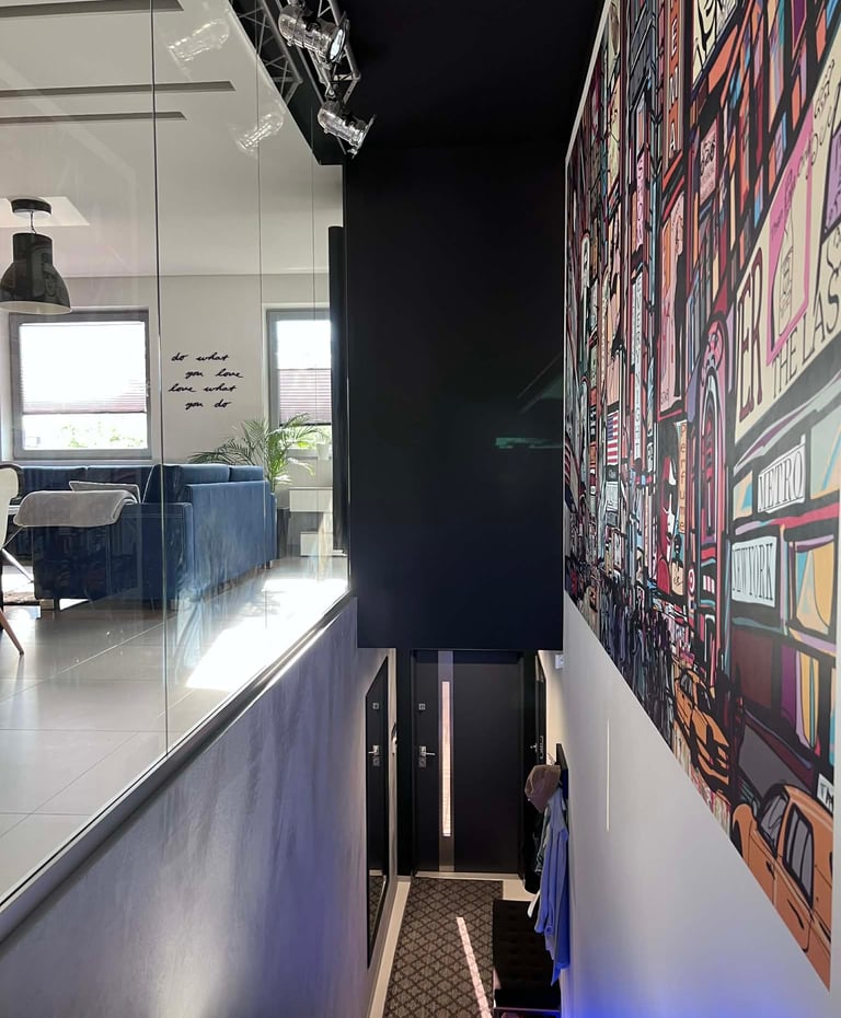 Za nowoczesne wnętrze z pomysłem wykorzystania nieoczywistych elementów jak namiastka murala w domu oraz oświetlenie sceniczne przy pokoju dziennym.
