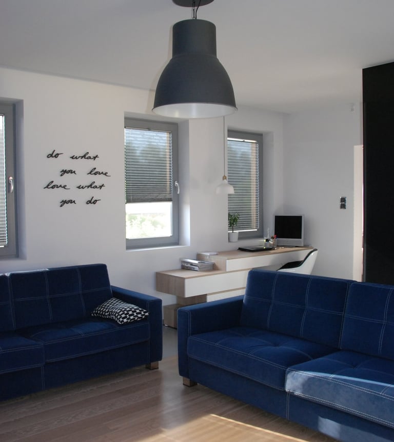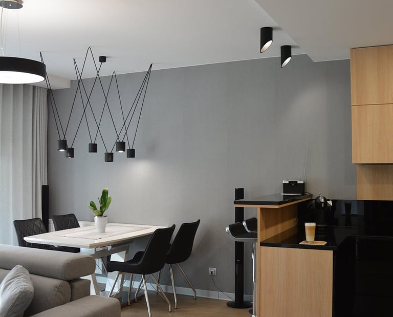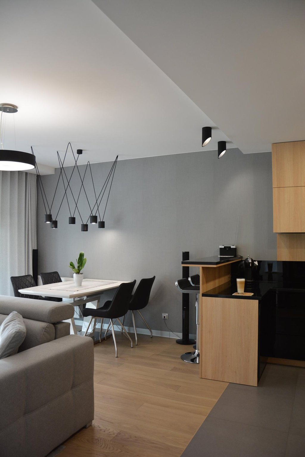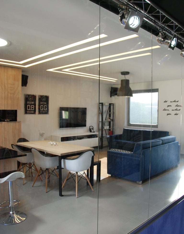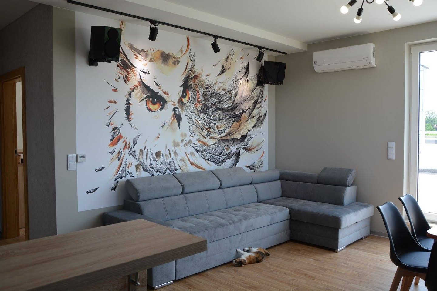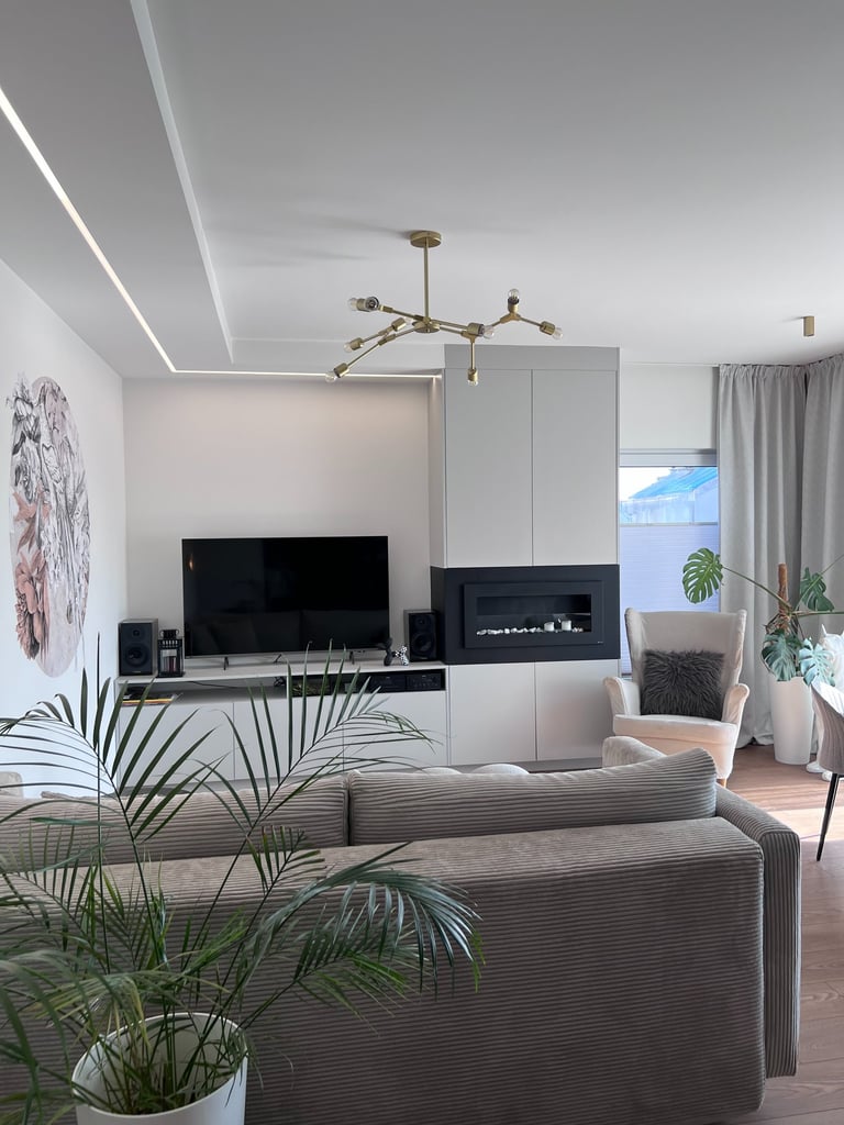 Za nowoczesne wnętrze z pomysłem wykorzystania nieoczywistych elementów jak namiastka murala w domu oraz oświetlenie sceniczne przy pokoju dziennym.