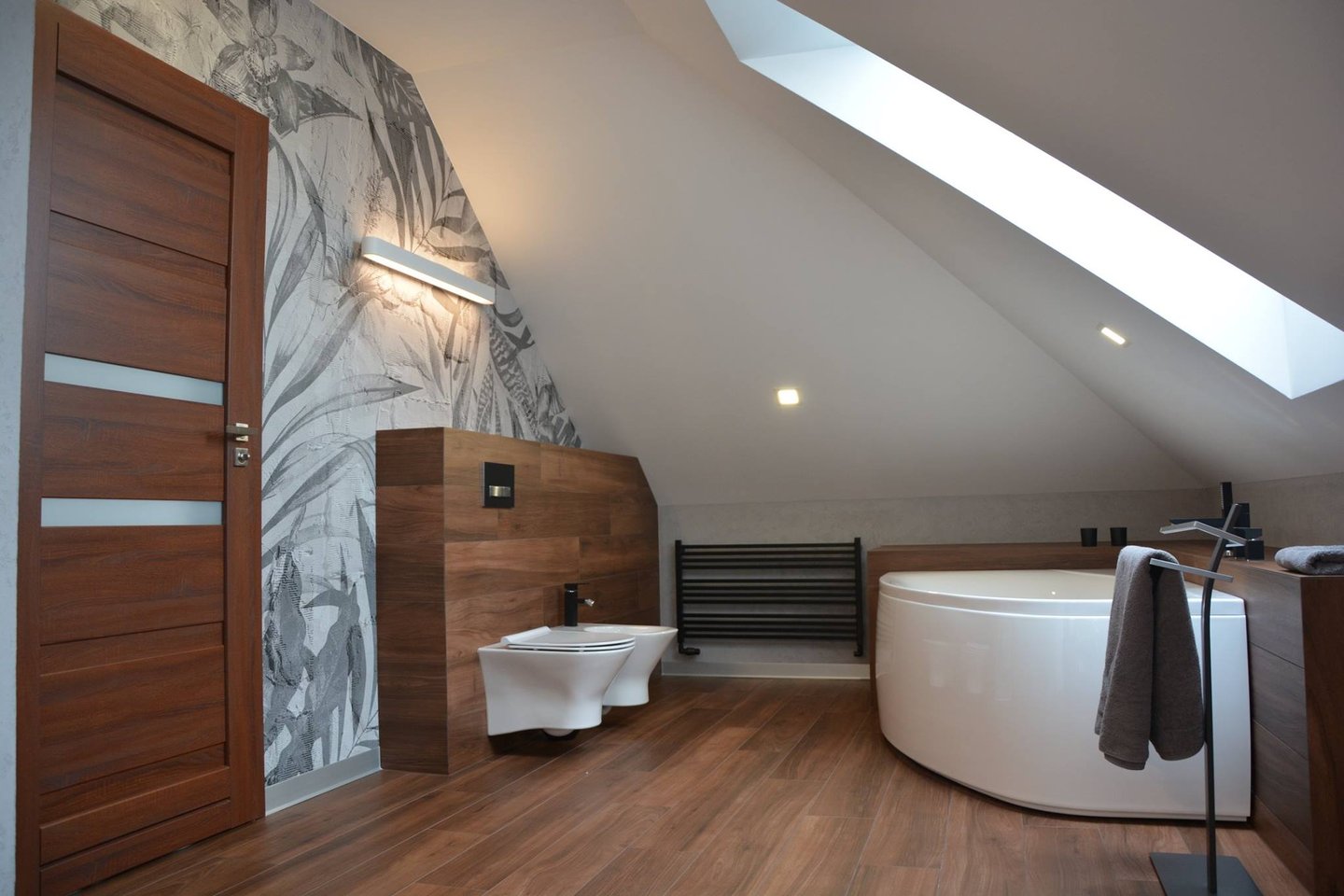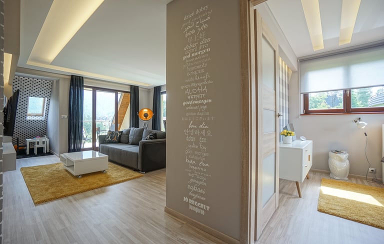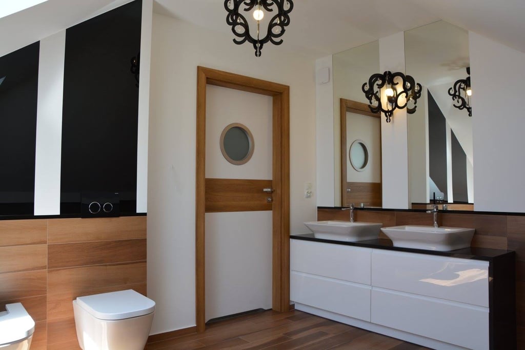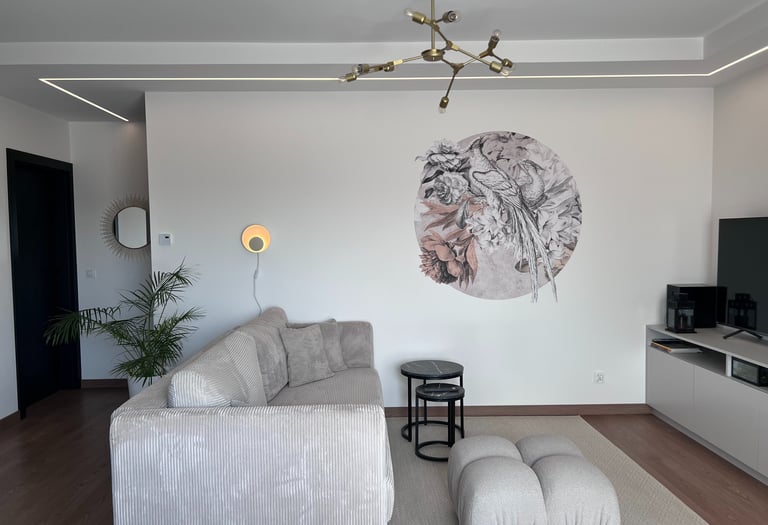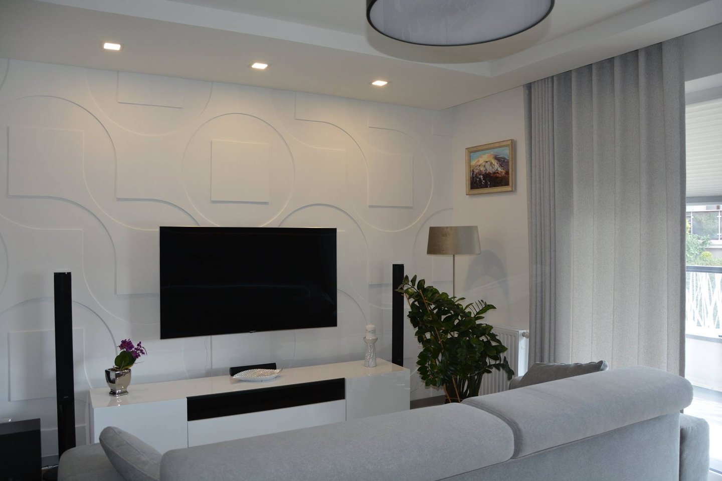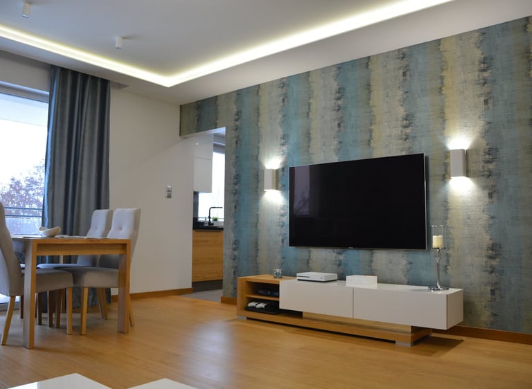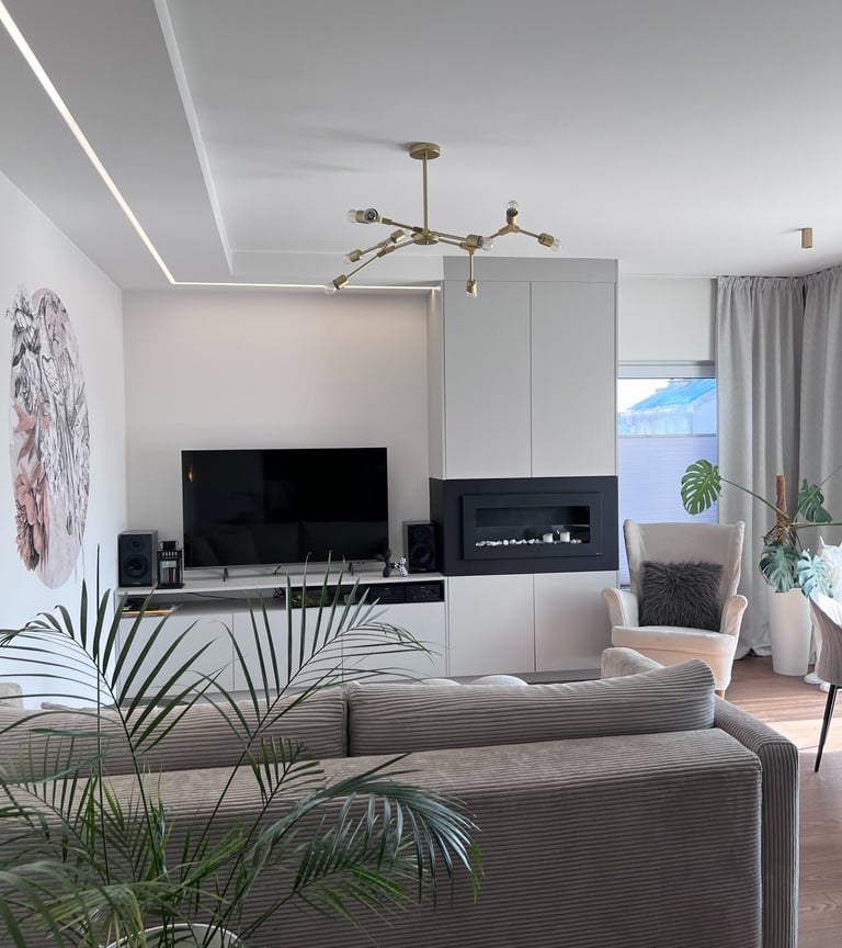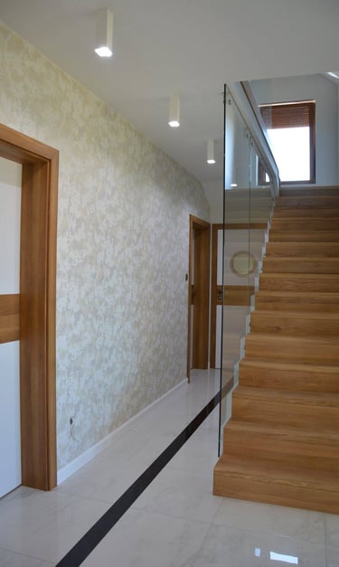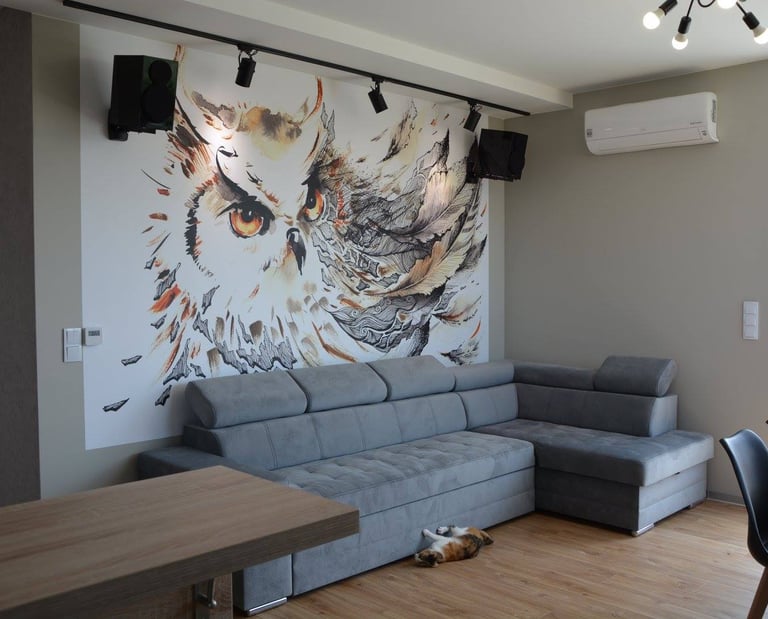 Za nowoczesne wnętrze z pomysłem wykorzystania nieoczywistych elementów jak namiastka murala w domu oraz oświetlenie sceniczne przy pokoju dziennym.