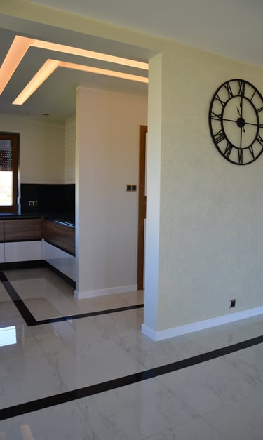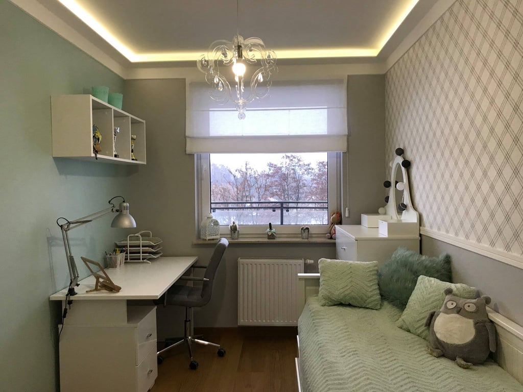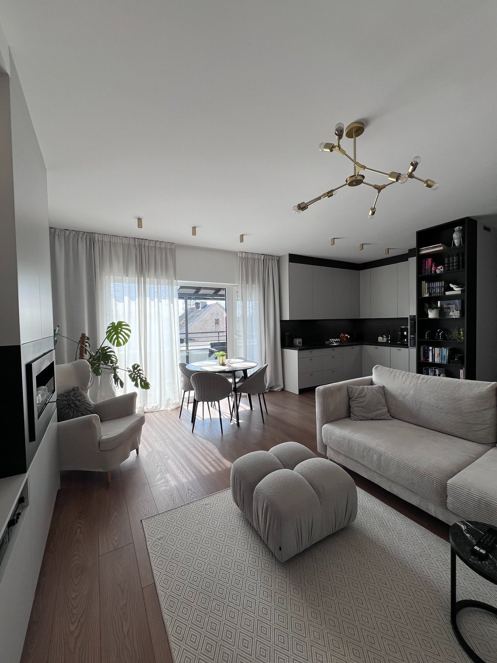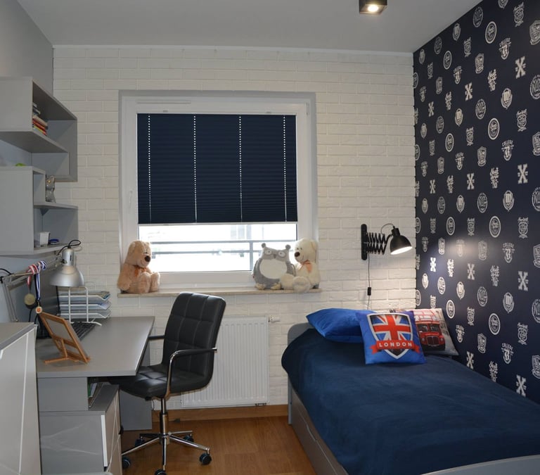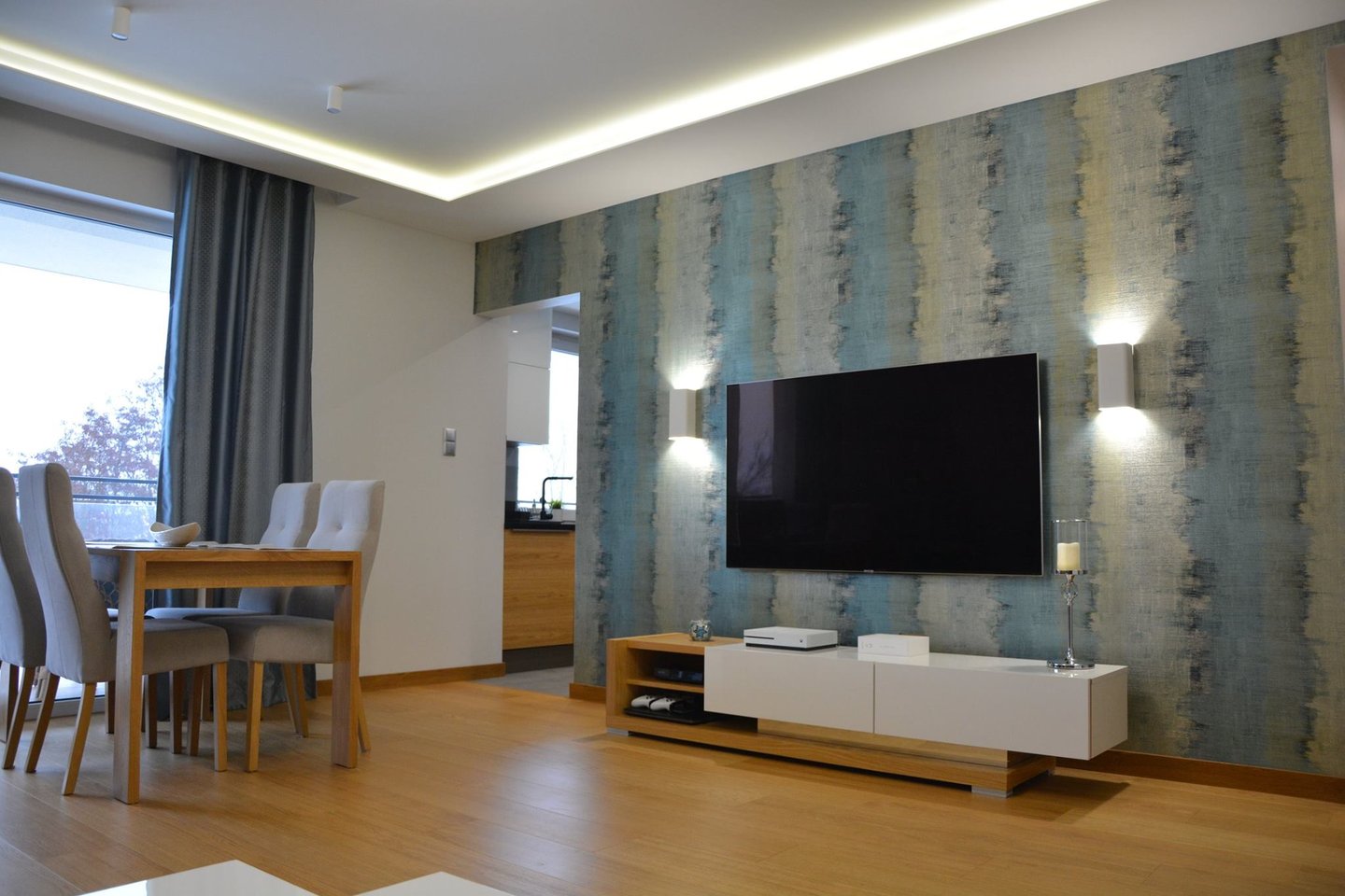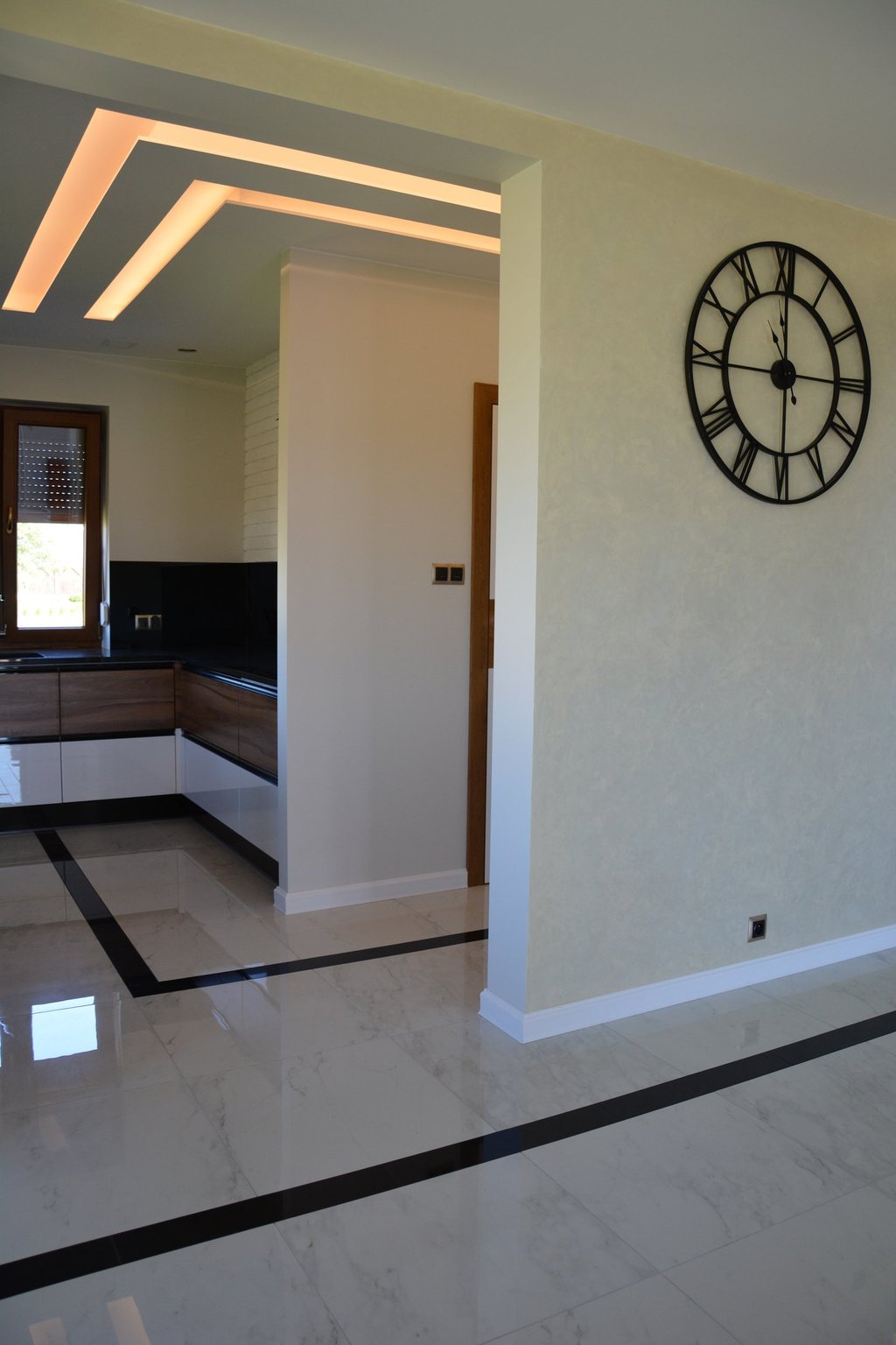 Za nowoczesne wnętrze z pomysłem wykorzystania nieoczywistych elementów jak namiastka murala w domu oraz oświetlenie sceniczne przy pokoju dziennym.