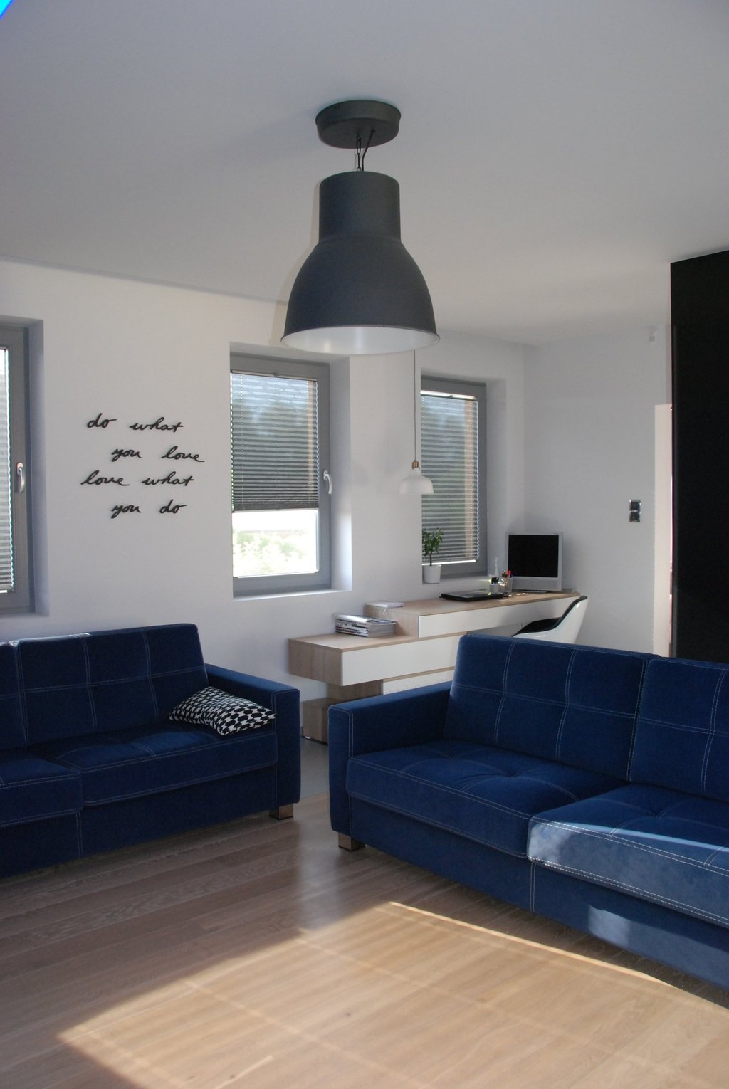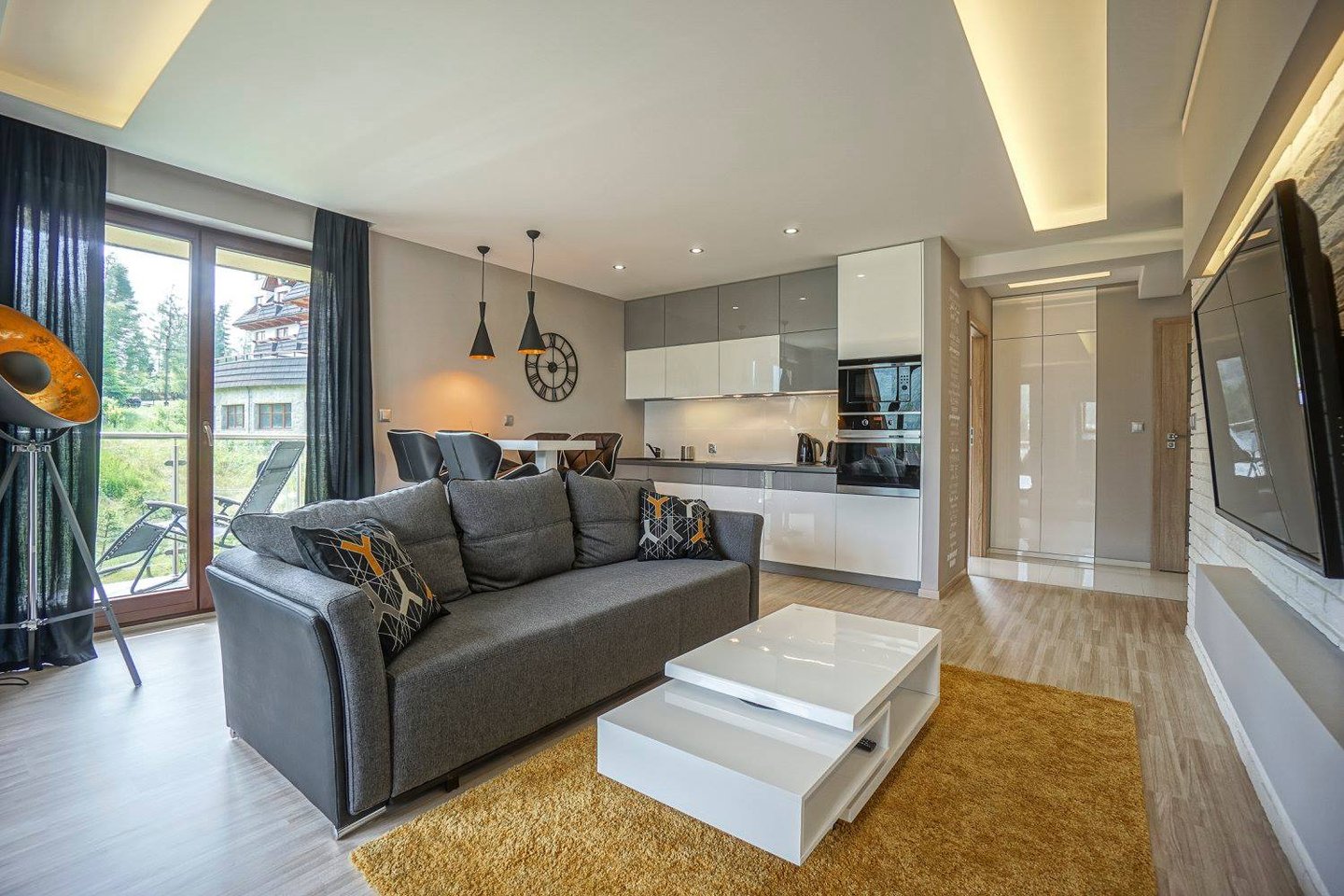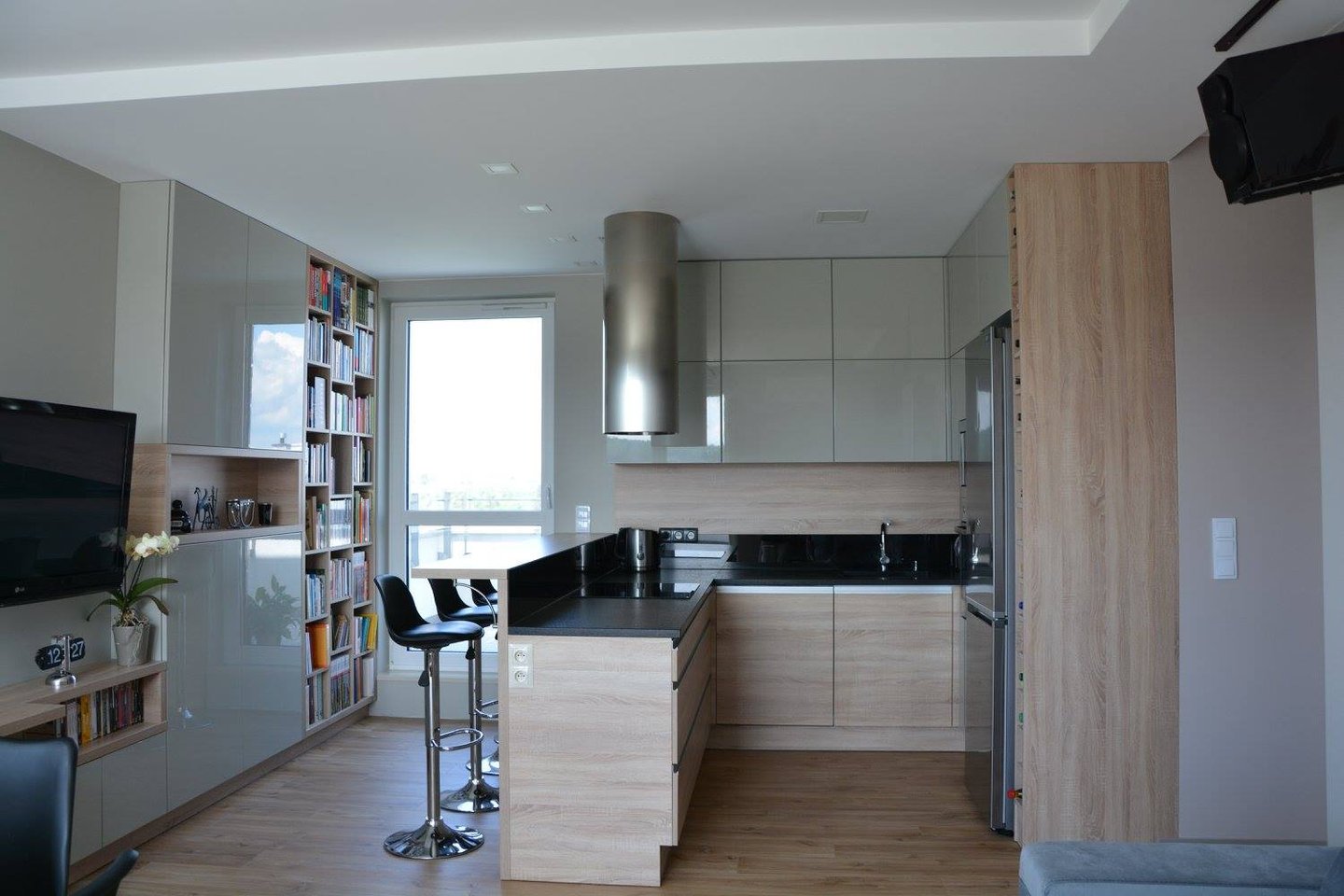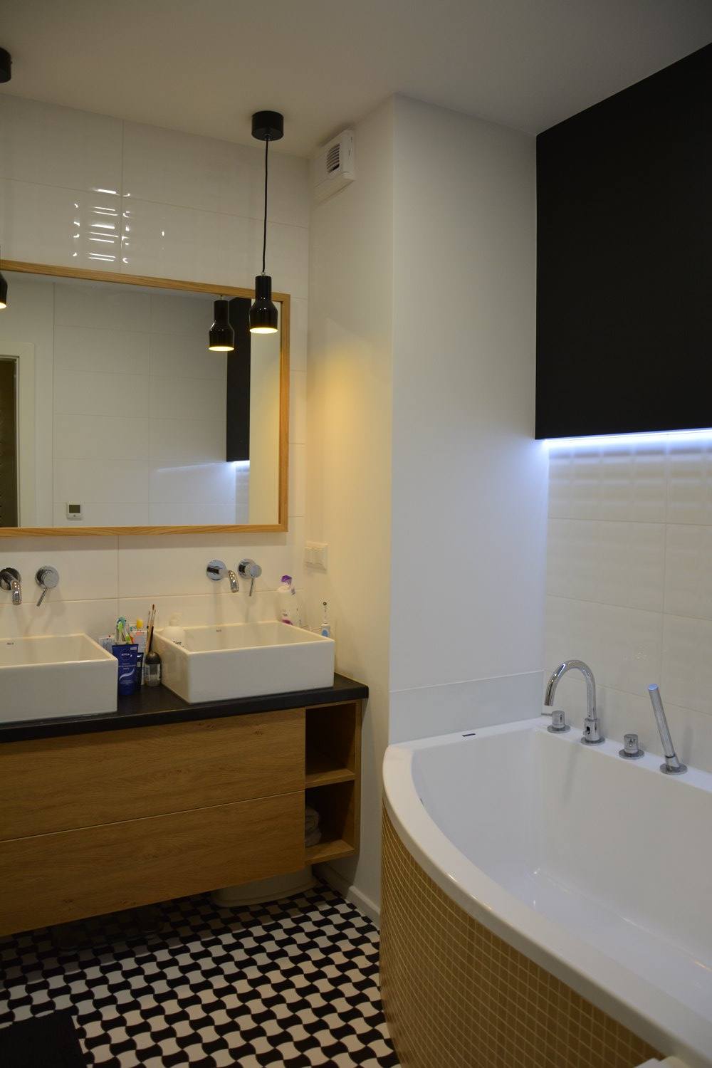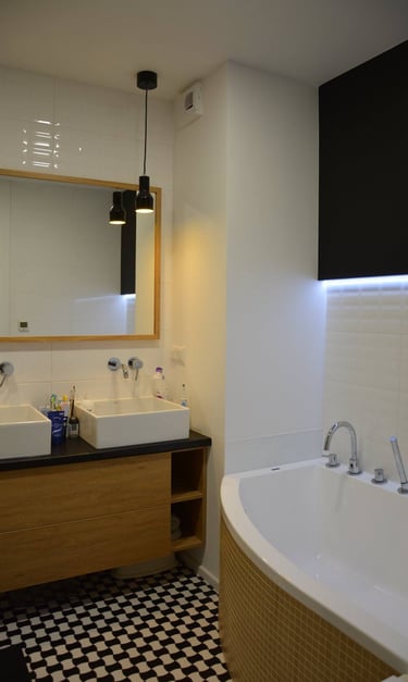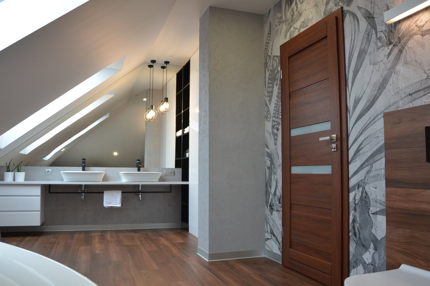 Za nowoczesne wnętrze z pomysłem wykorzystania nieoczywistych elementów jak namiastka murala w domu oraz oświetlenie sceniczne przy pokoju dziennym.
