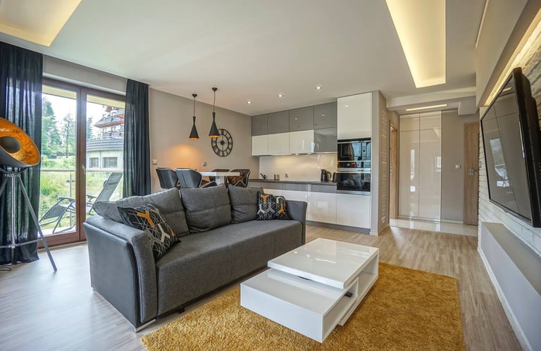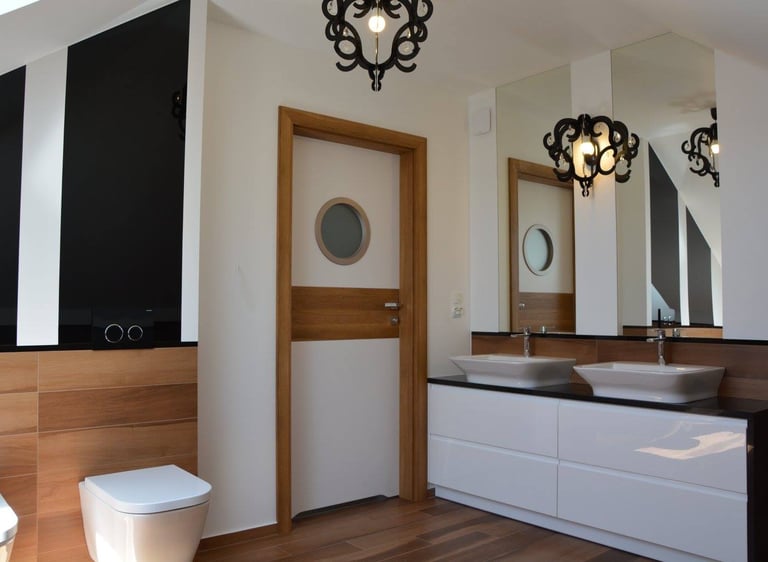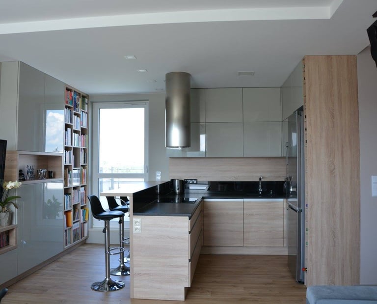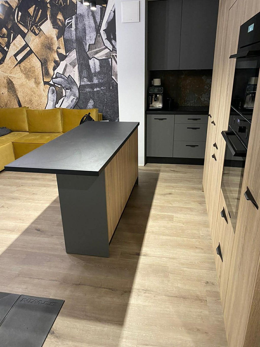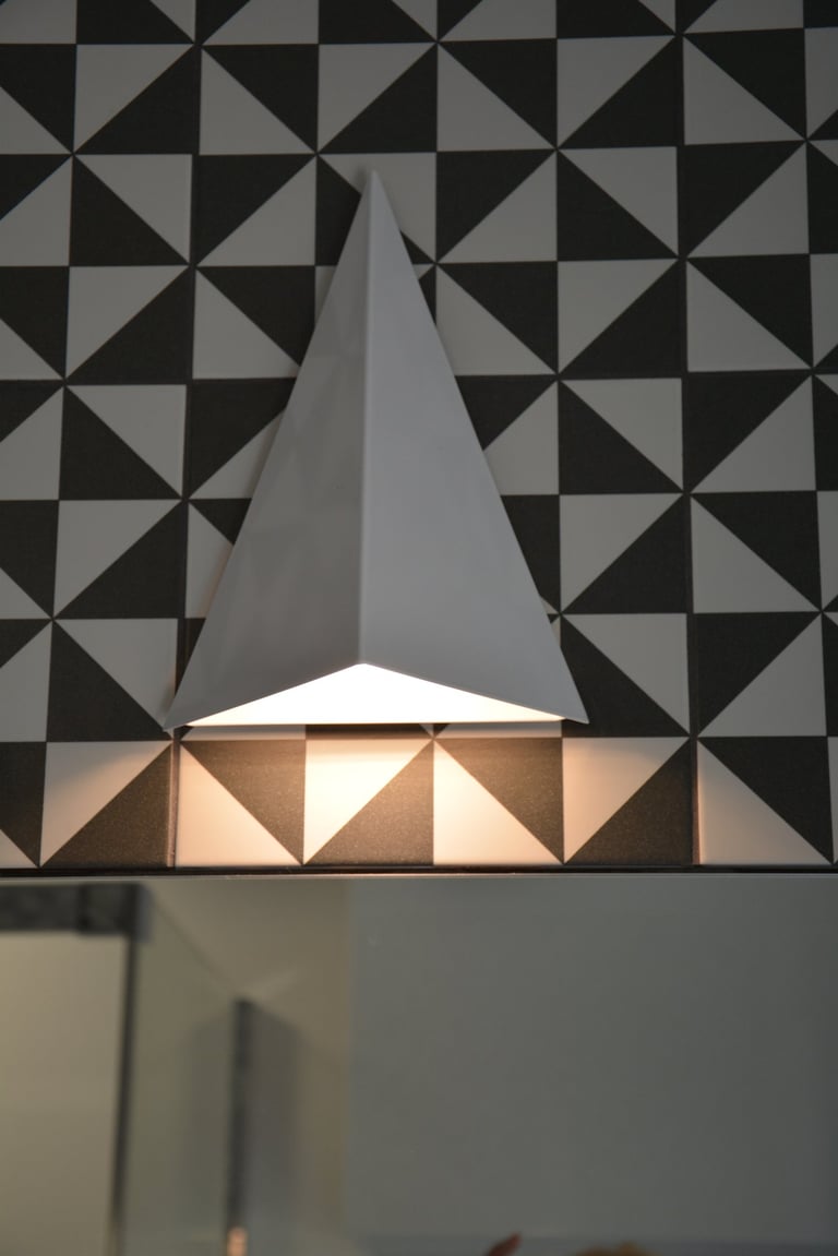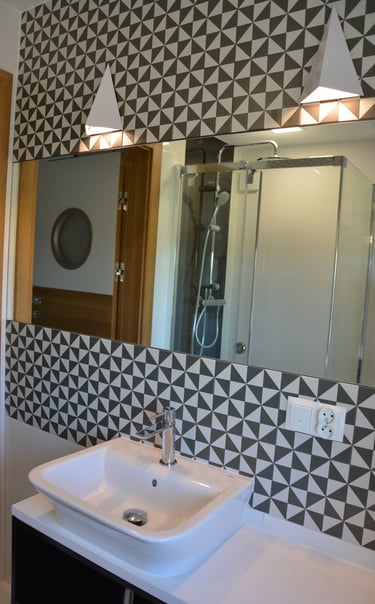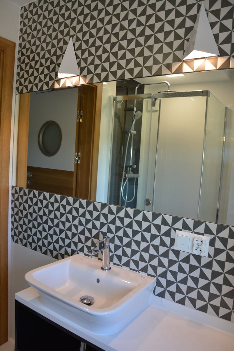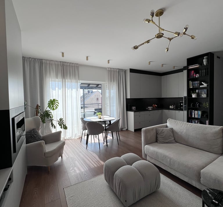 Za nowoczesne wnętrze z pomysłem wykorzystania nieoczywistych elementów jak namiastka murala w domu oraz oświetlenie sceniczne przy pokoju dziennym.